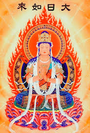 Vairocana, Tathagata Matahari yang Agung, setelah menguraikan dharma di tempat tinggal Mahesvara. Tathagata yang saat itu telah muncul dalam tubuh emas, dengan rambut menumpuk di atas kepalanya, membentuk jambul (sanskrit: ushnisha) yang kelihatan seperti mahkota dengan Lima Buddhas duduk di atasnya. Tathagata yang telah memancarkan sinar banyak warna, dan berjubah sutra seperti jubah putih sempurna. Ini adalah tanda mencapai pencerahan sempurna Suddhavasa di Surga. Beberapa orang menganggap bahwa Vairocana, Tathagata Matahari yang Agung, adalah Dewa Matahari. Namun, saya merasa bahwa saat Great Tathagata matahari ini identik dengan matahari itu sendiri, yang merubah kegelapan menjadi terang , cahaya matahari membagi dunia ke dalam siang dan malam, dan ada tempat di mana sinar matahari tidak dapat dijangkau. Dengan demikian, kata besar/agung yang ditambahkan ke kata Matahari untuk menandakan bahwa terang Buddha adalah sepenuhnya adalah sinar kebijaksanaan dari Great Tathagata Matahari bersinar sepenuhnya untuk menenangkan seluruh semua alam dharma.